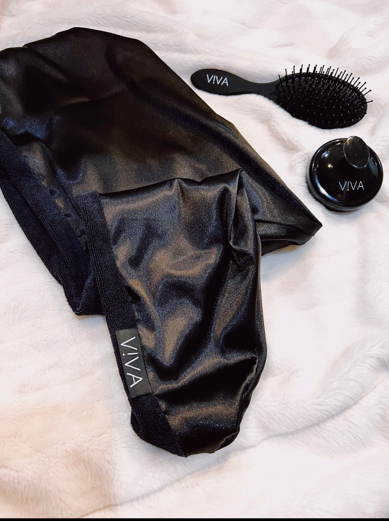 Our V!VA black bundle with Microfiber Towel Wrap, Scalp Brush, and Detangle brush!